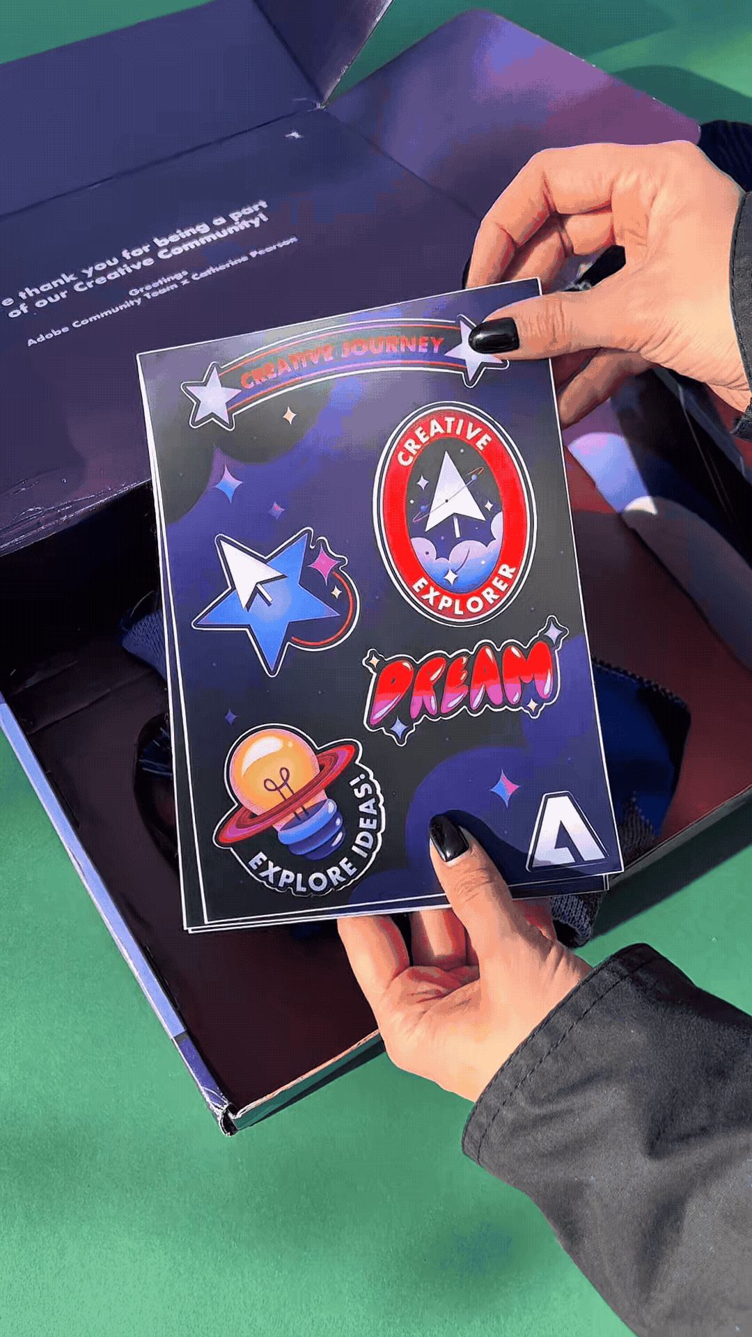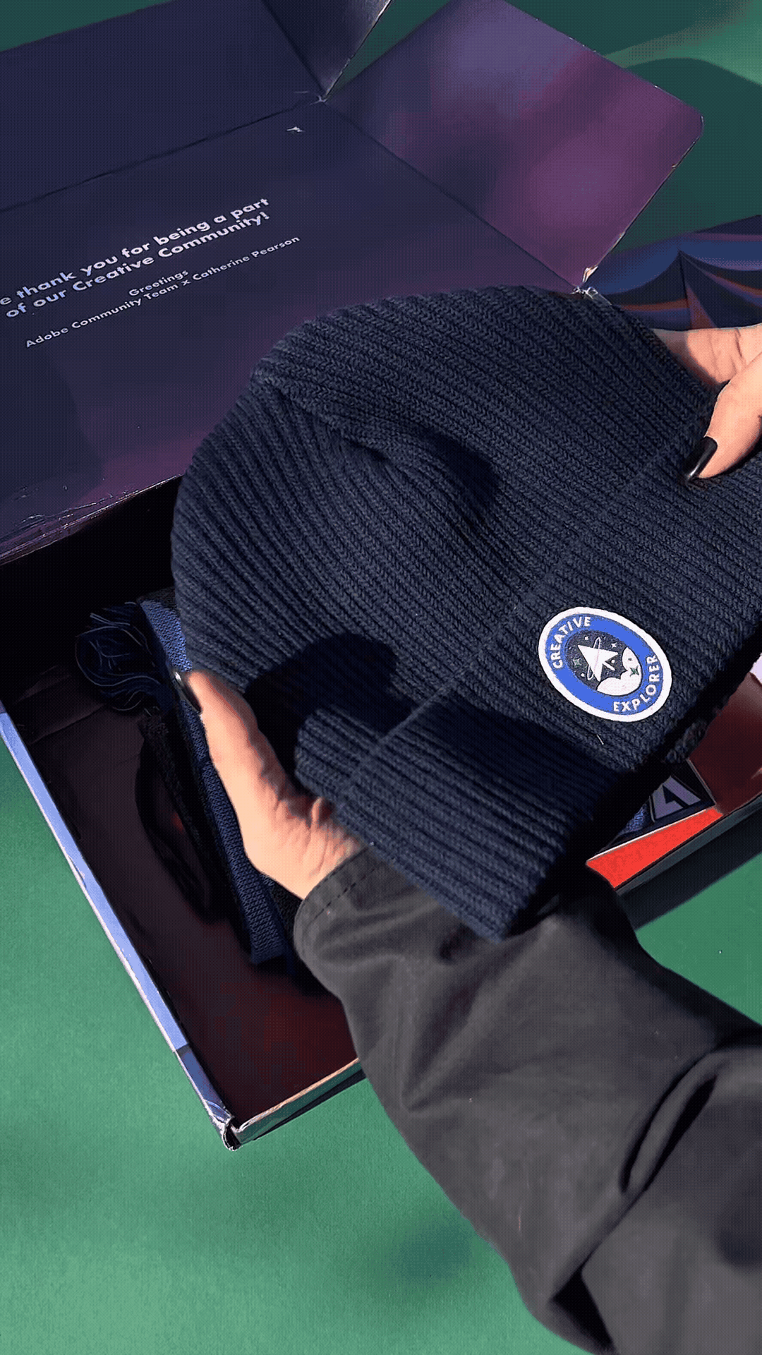 Catherine designed for the Adobe Premiere 2024 Christmas collection a custom box, a cozy beanie, a festive scarf, a playful sticker set, and a Christmas card,all created to invite you into the digital world of creativity and exploration.