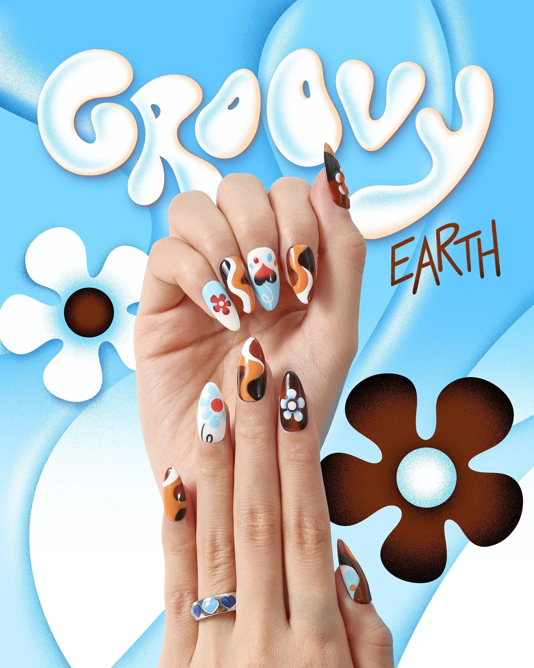 Inspired by our deep connection with the planet, these nails playfully feature hand-drawn waves, earthy tones, and groovy flowers, capturing the roots we share with Mother Earth.