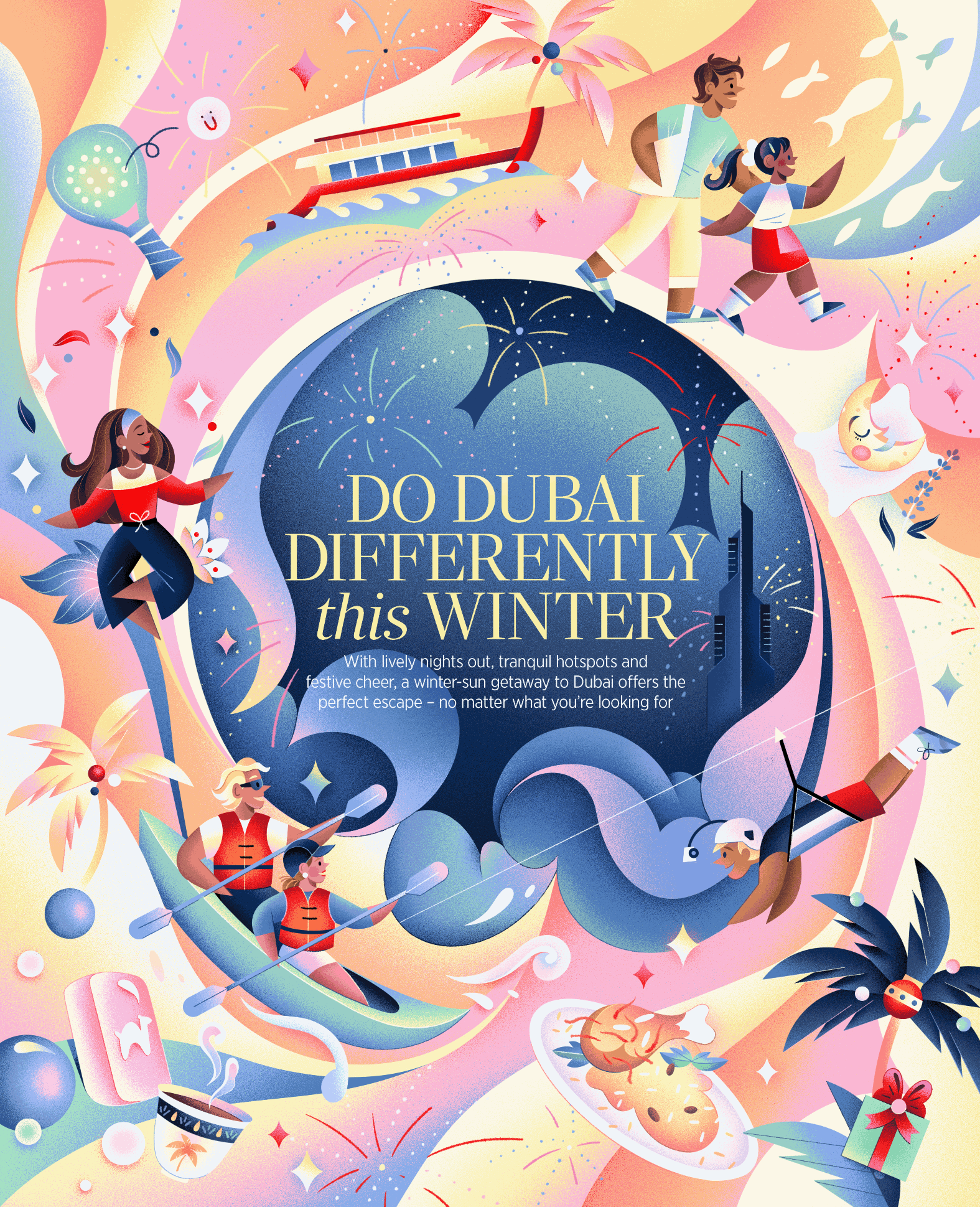Do Dubai Differently this Winter! Custom cover illustration and icon set created for The Telegraph in partnership with Southall Travel, for their printed and web guide “The Winter Dubai Itinerary for Every Traveller.” Each scene brings to life a tailored Dubai experience, from the serene to the adventurous, offering a vibrant visual journey through the city.